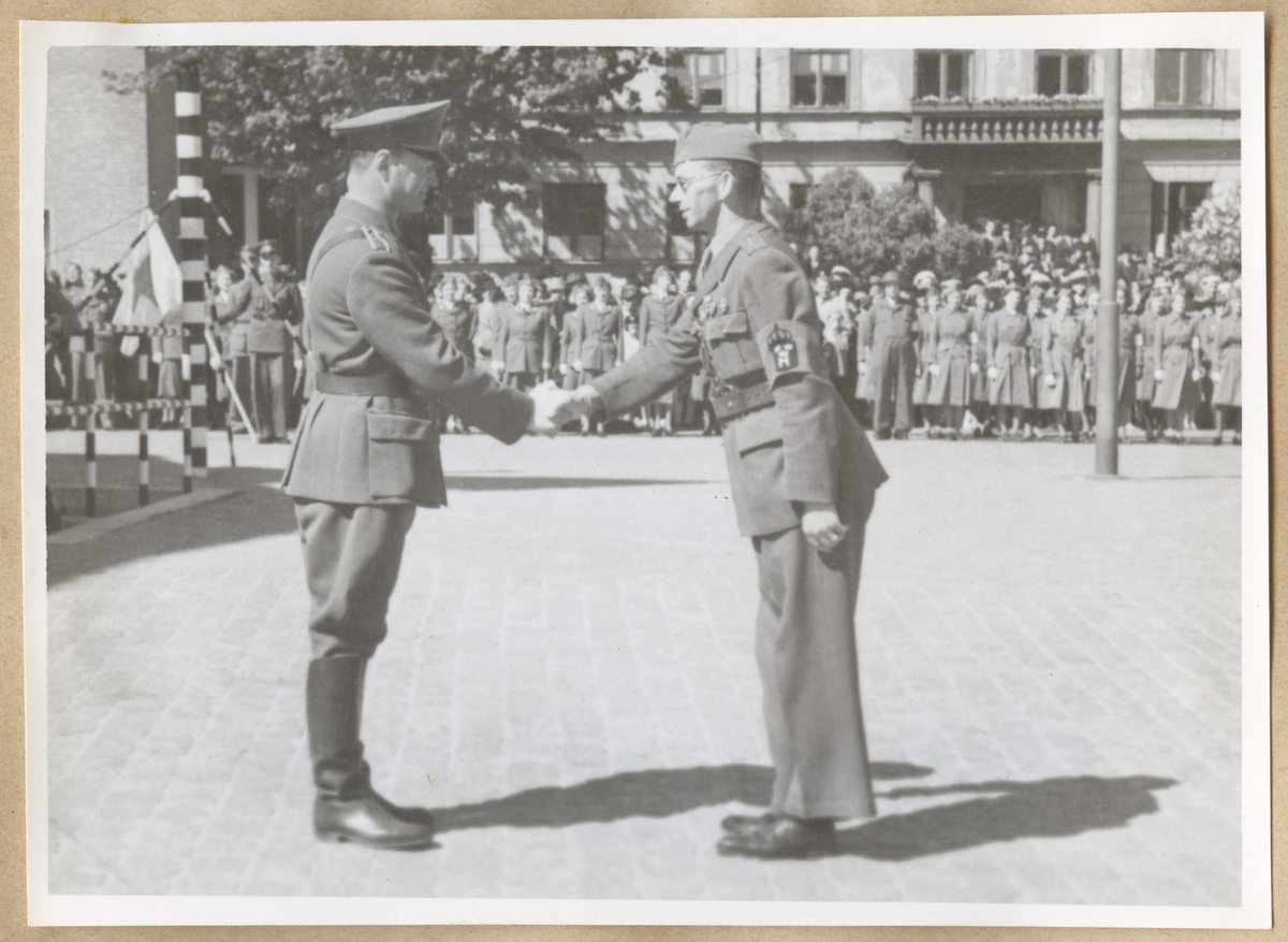 En militär skakar hand med en hemvärnssoldat på stortorget framför rådhuset. I bakgrunden står en folkmassa med lottor längst fram.