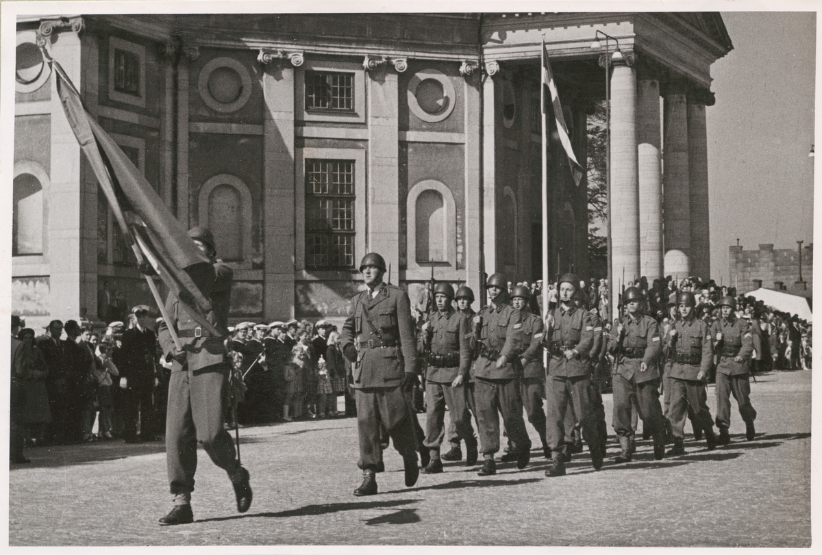 Flottister på marsch genom stortorget. Framför dem går en soldat med en svensk flagga. I bakgrunden syns civila åskådare uppradade framför Trefaldighetskyrkan.