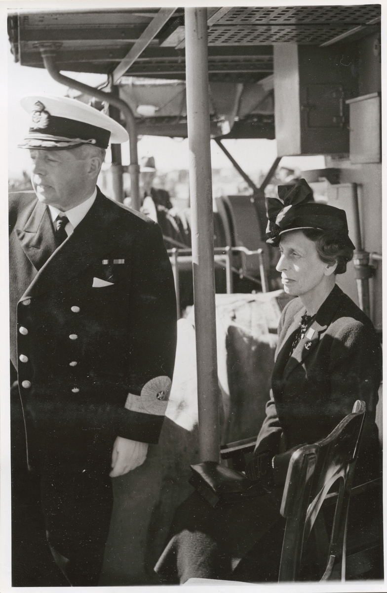 Titel: Drottning Louise sitter ned ombord på ett fartygsdäck. Vid sidan om henne står Konteramiral Ehrensvärd.