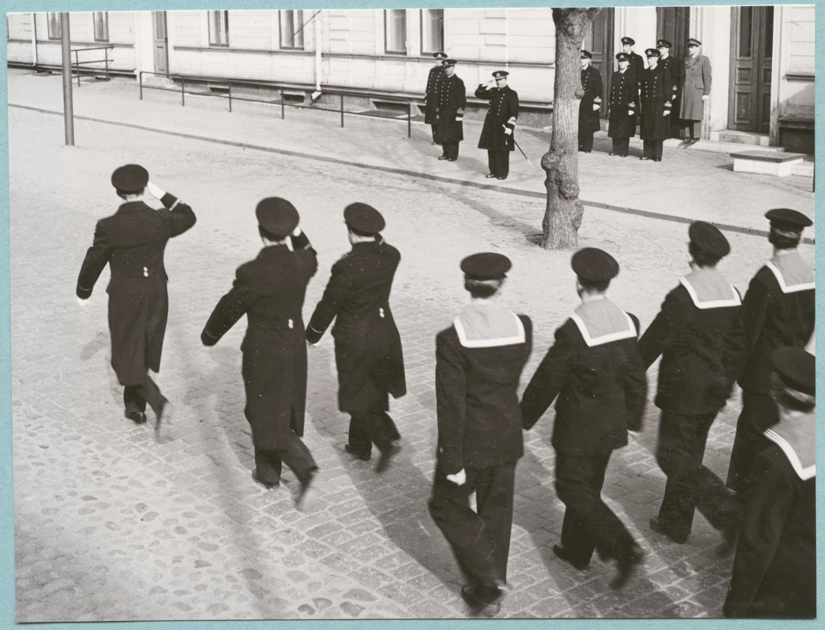 Flottister går i en parad längs Drottninggatan i Karlskrona, ledda av en fänrik som gör honnör mot Konteramiral Samuelson, som står med andra högre sjöofficerare utanför Bataljon Sparre. Fotot är daterat till den 17-3-52.