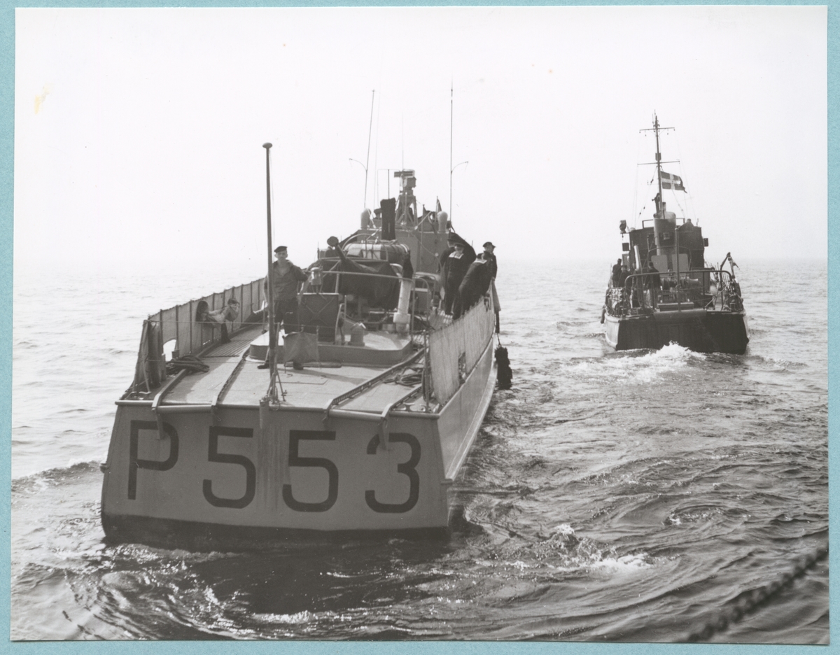 Två danska torpedbåtar, varav den ena identifierbar som HAVØRNEN med nummer P553, syns färdas i vattnet med aktern vänd mot kameran. Båda fartyg har besättning ombord.