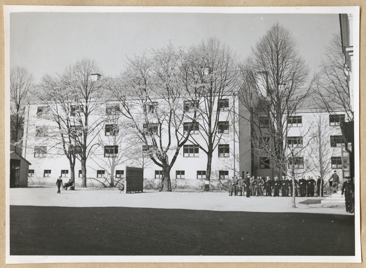 Uniformsklädda militärer står på en grusplan utanför Varvsgatan 3 i Karlskrona. Byggnaden består av två stramt utformade byggnadskroppar med putsade ljusa fasader. Byggnaden täcks något av en trädrad.