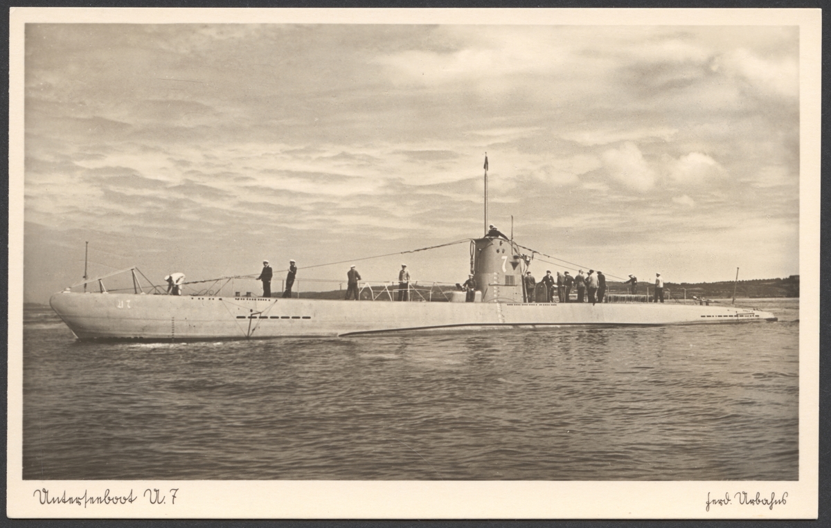 Fartygskort av ubåt U 7 från den tyska krigsmarinen 1935. Ubåten syns i fart till sjöss från babordssidan. Flera sjömän står på däck och uppe på tornet.