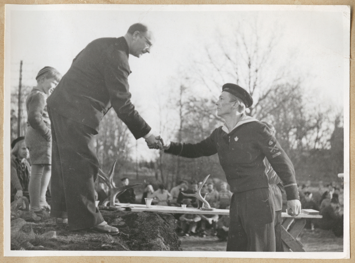 Kostymklädd man tar i hand med en uniformsklädd värnpliktig furir (Artmatros). I bakgrunden syns fler människor och barn, även en bänk med pokaler och dekorativa hjorthorn på.