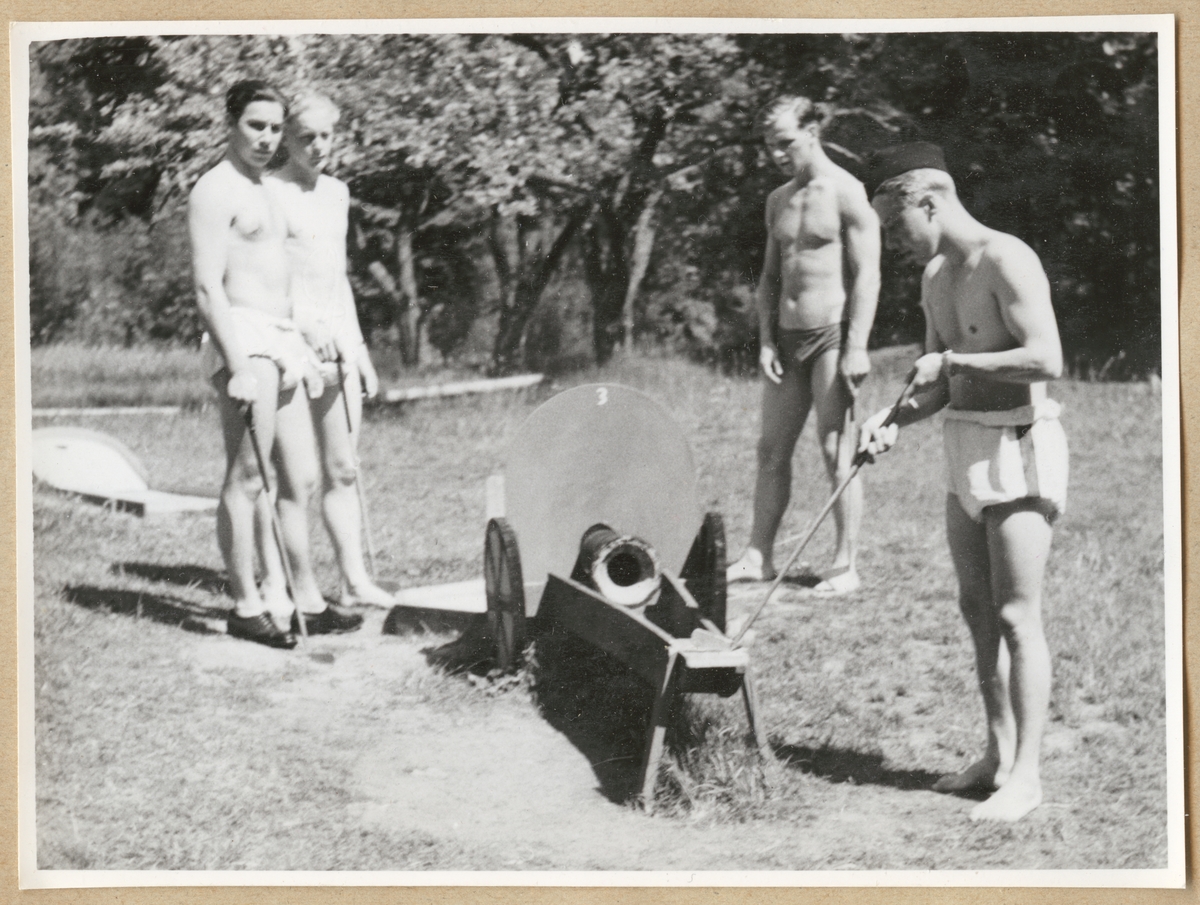 Titel: Fyra män iförda badbyxor står vid en låtsaskanon som en del av ett spel. Runt omkring är det grönska.