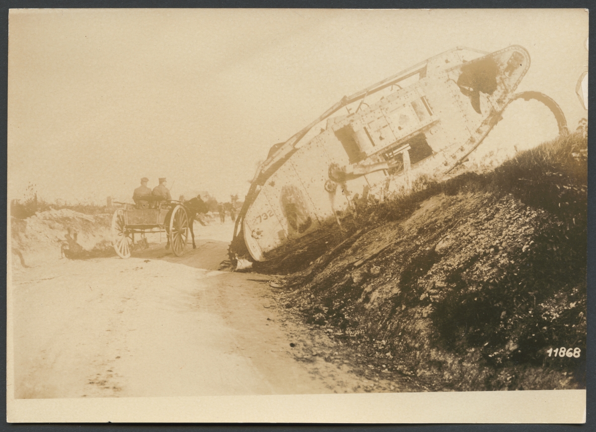 Bilden visar en förstörd Mark IV stridsvagn som har blivit liggande vid vägslänten. På högersida av fordonet syns ett hål och larvbandet som har sprukit.