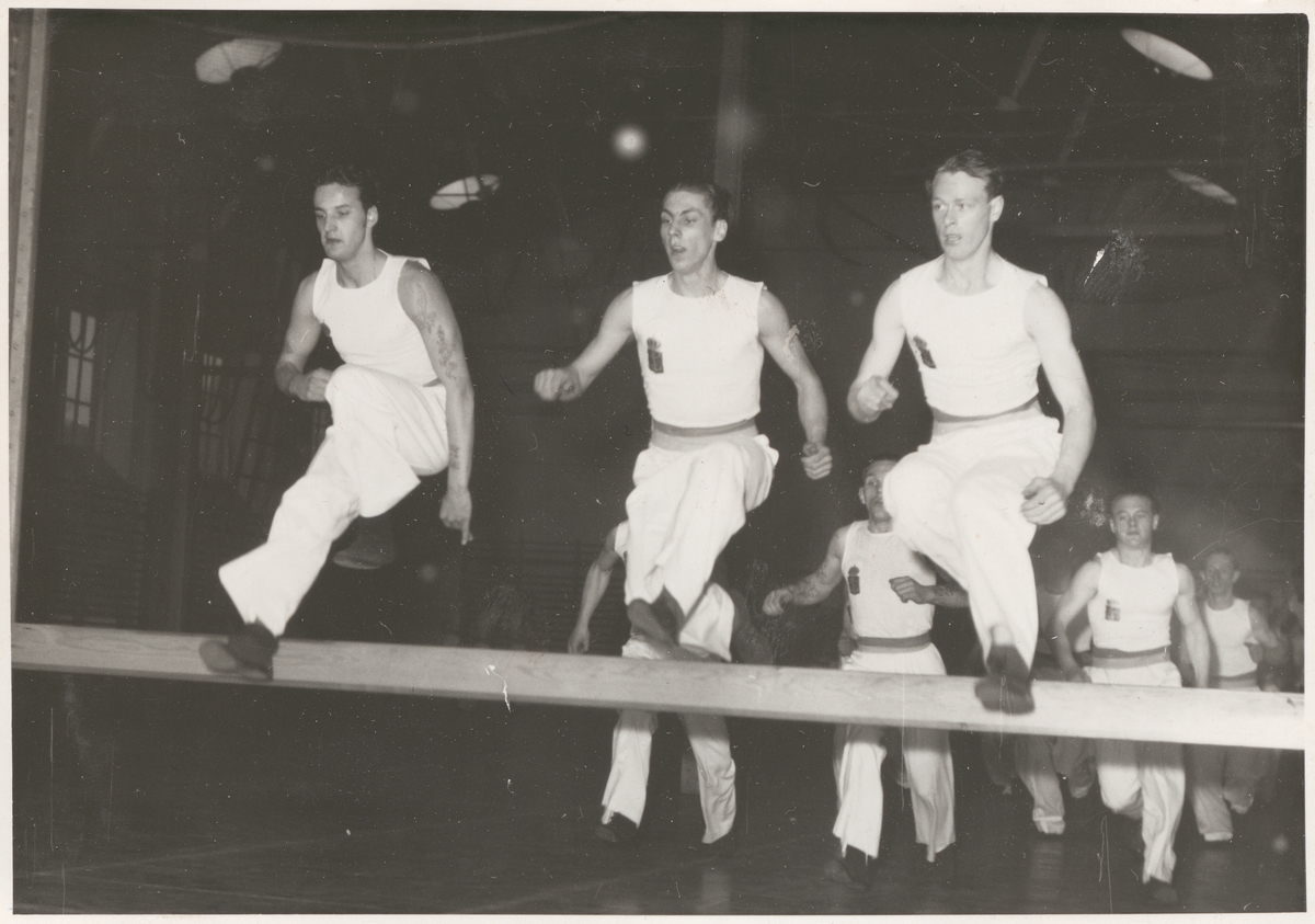 Tre män på rad ses hoppa över en träbom. Bakom dem kommer ytterligare idrottsklädda män i tre led springandes mot bommen. Anläggningen ser ut att vara en idrottshall.