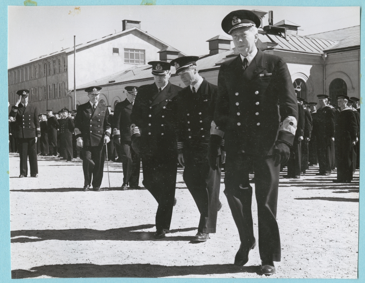 Viceamiral Strömbäck och konteramiral Samuelson går tillsammans med en grupp höga militärer på bataljon Sparres kaserngård. Bakom dem står flottister uppställda. Samtliga är klädda i uniform. I bakgrunden syns Sparres exercishus.
