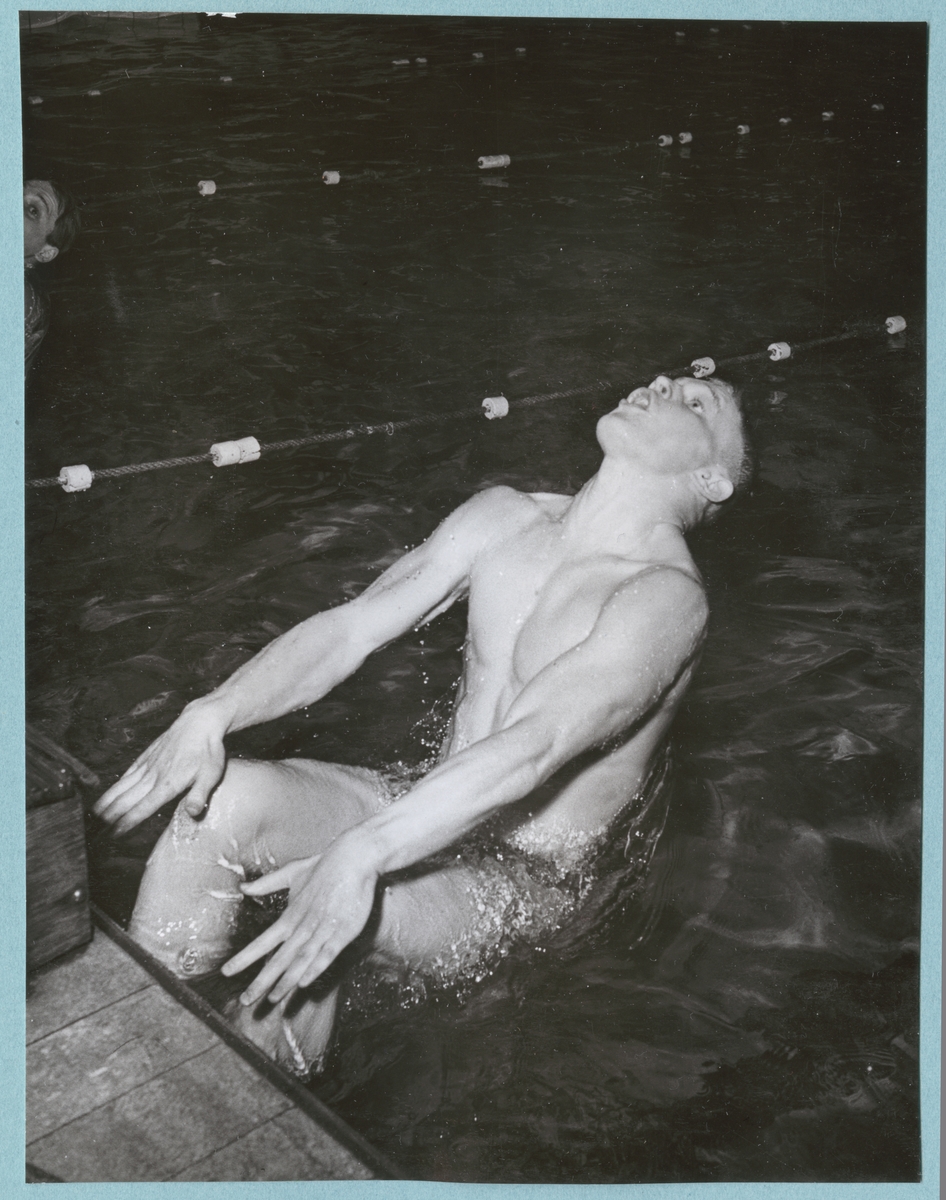 Titel: En simmare kastar sig bakåt i vattnet från kanten i en simbassäng. Fotot är daterat till 15-3-52