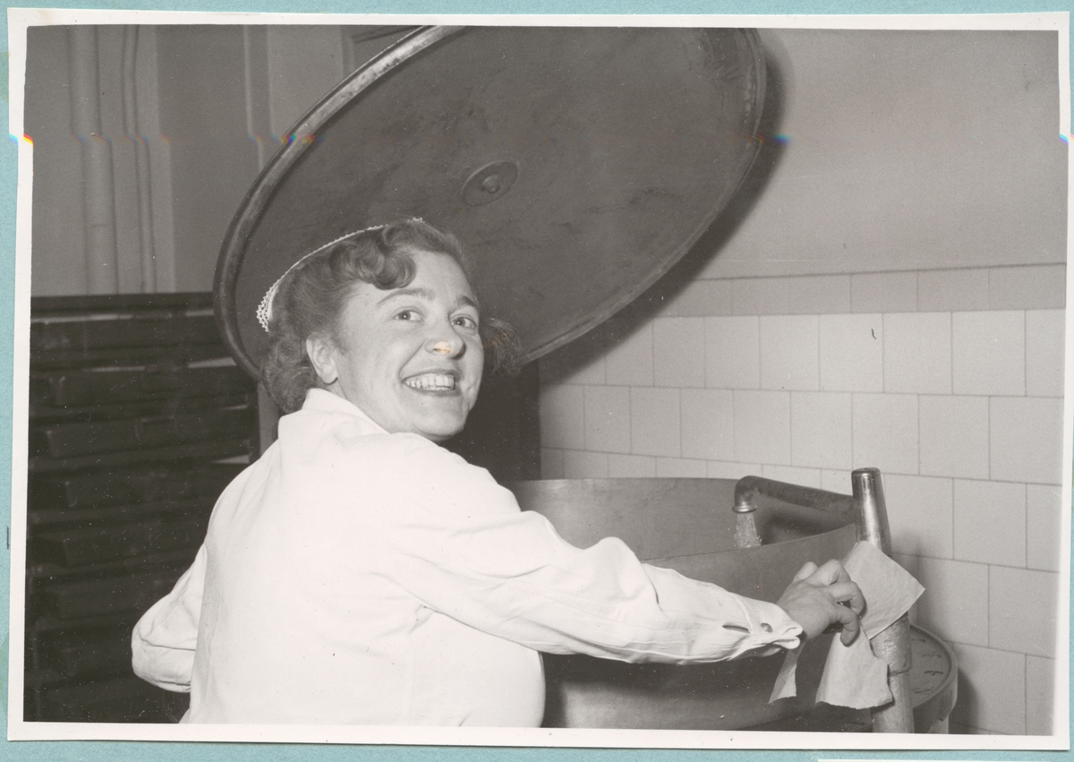 Titel: En kvinna står i ett kök och tappar upp vatten i en stor gryta. Hon är vänd mot kameran och ler.
