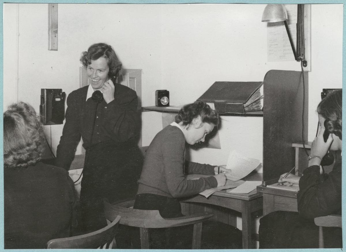 Bilder från Krigsledningscentralen. En grupp kvinnor sitter vid arbetsskrivbord och skriver på papper eller talar i telefoner.