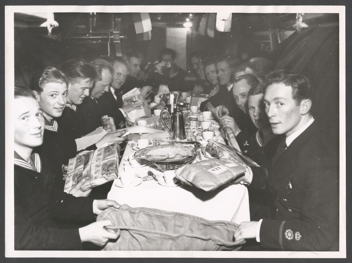 Bilden visar besättningen av en ubåt som äter julbord ombord i torpedrummet. Manskapet sitter runt ett fin dukat bord med levande ljus, bordsduk och servetter. Till höger och vänster syns de uppfällbara sängar. På översta bildkanten syns en talja med upphängd kedja för lyft av torpeder. Första mannen i höger rad framifrån är Evert Ingemansson.