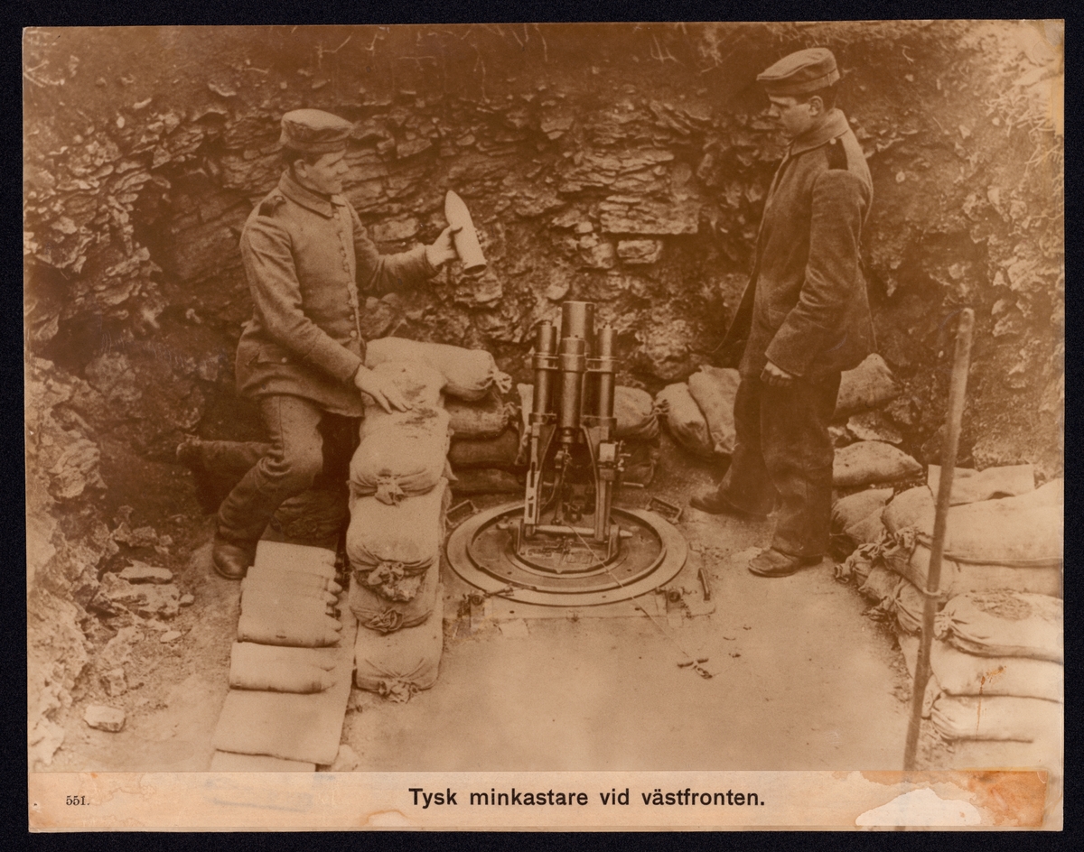 Bilden visar två soldater som demonstrerar användning av en mindre minkastare. Båda män verka vara ganska avslappnad. Mannen på vänster sidan visar upp granaten med ett leende.