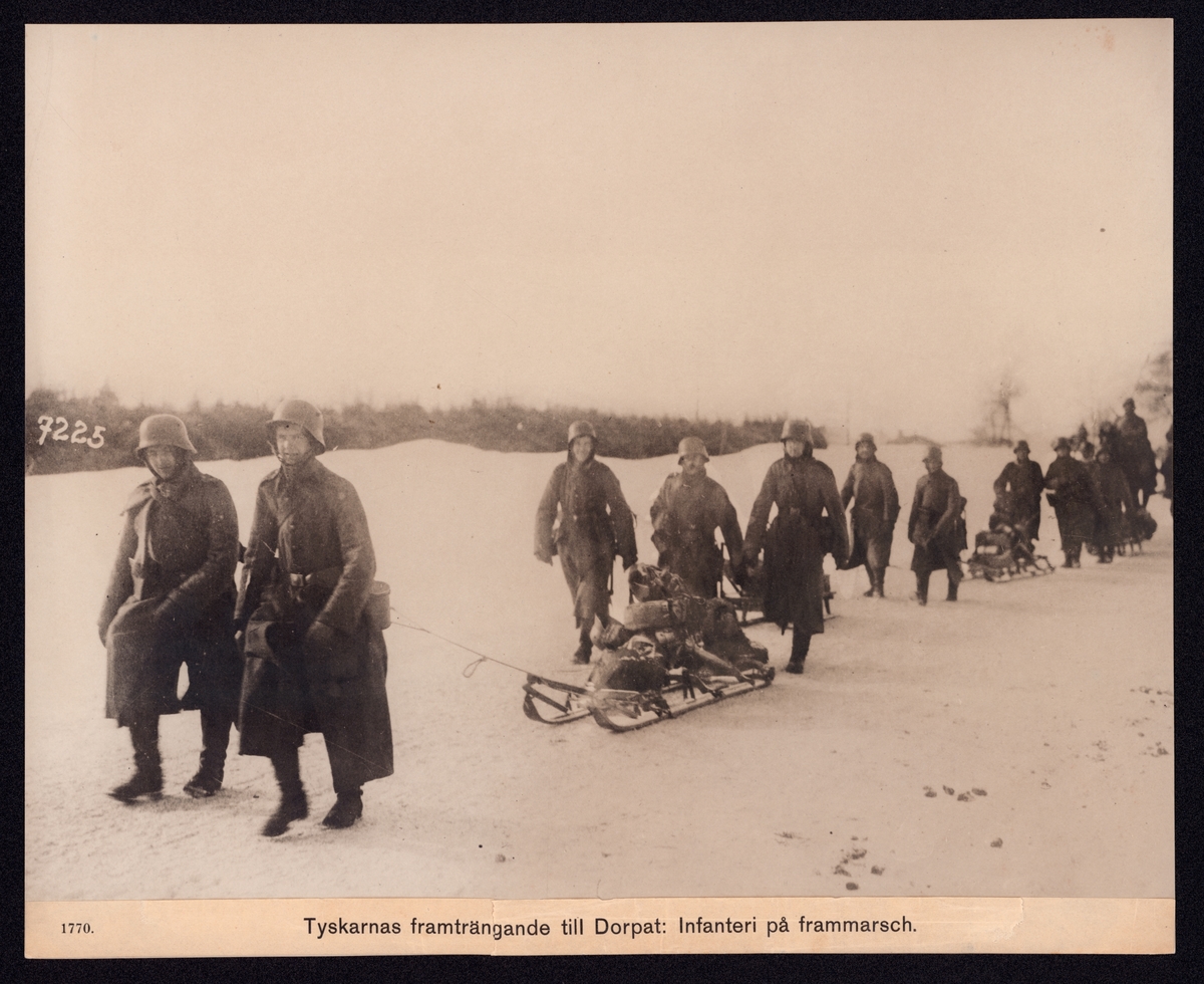 På bilden syns en kolonn soldater på frammarsch under vintertid. Soldaterna dra sin utrustning på slädar.