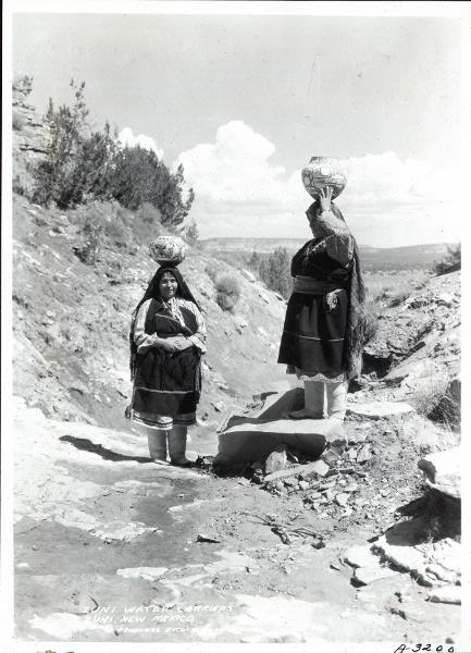 Två Zuni-kvinnor som bär vatten i krukor på huvudet. Ökenlandskap (?).