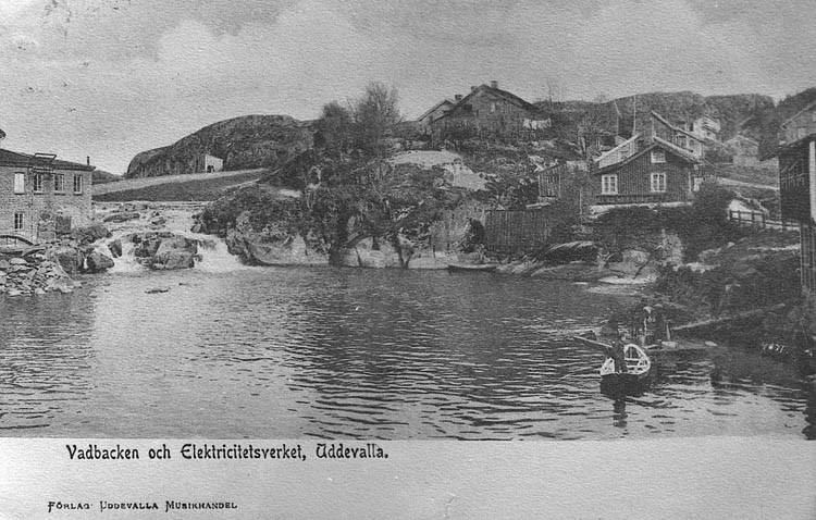 Postkort. "Vadbacken och Elektricitetsverket, Uddevalla." vid Bäveån