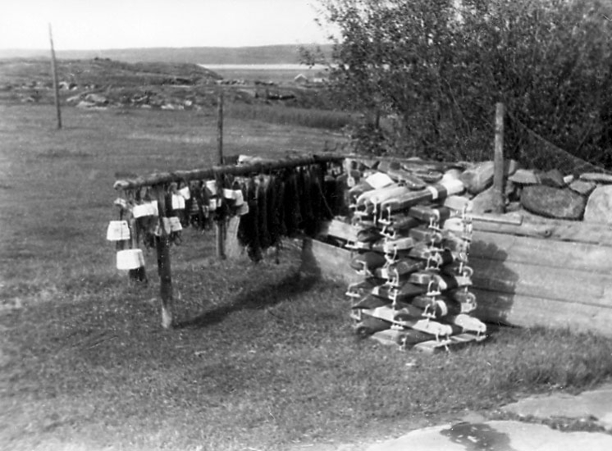 Skrivet på baksidan: "Halland, Viske hd, Värö sn., Båtfjorden. Välen, linor och poltar till hummerkupor."
