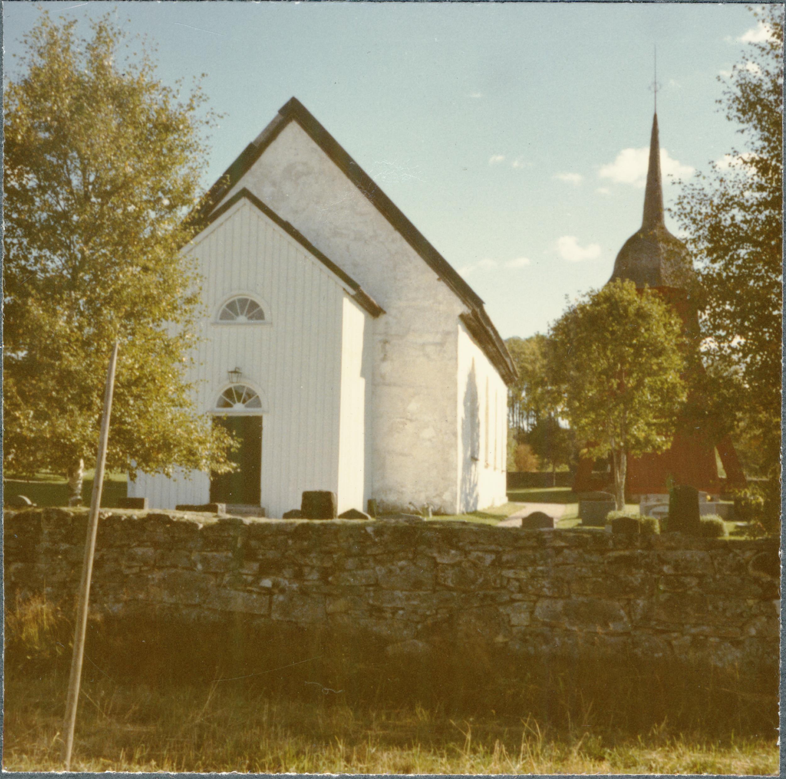 Kyrkan och klockstapeln från väster.