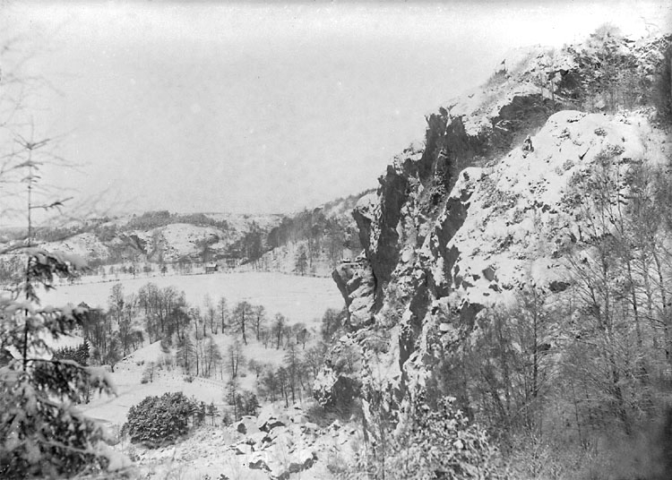 Enligt senare noteringar: "Fotot taget från vattenfallet vid Kung Karls skansar i Kvistrum. Vid gärdeskanten syns Myrbäcks och Hedins hus i Krokklev." (BJ)
