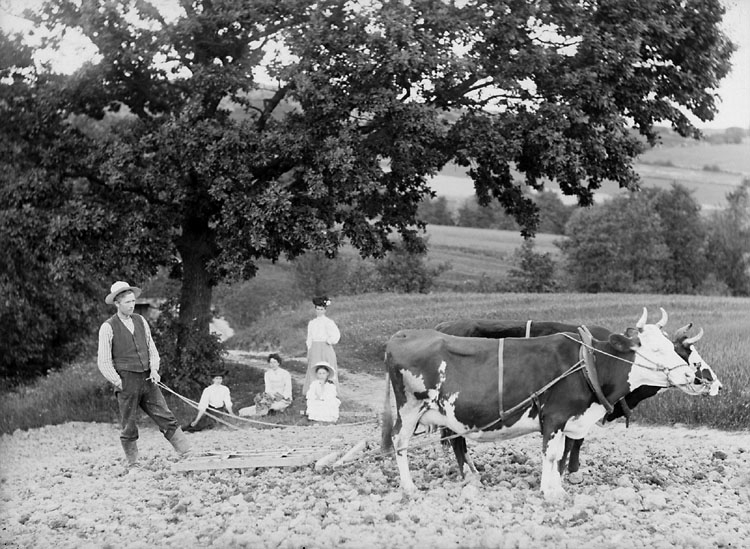 Enligt senare noteringar: "Följande text tillhörde bilden införd i veckotidning på 1970-talet; 'Min svåger i Munkedal harvade med kor, som så många andra förr. De var goda dragare, men fort gick det inte. Familjen kom ut med kaffe.
