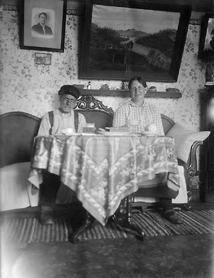Enligt senare noteringar: "Äldre par vid kaffebord." (BJ)