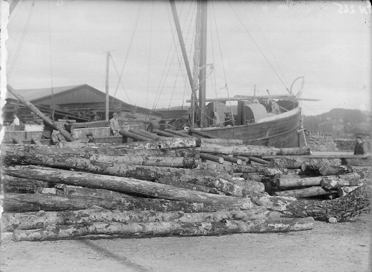 Enligt senare noteringar: "Aspstockar avsedda för Tändsticksfabriken, i hamnen Uddevalla. I bakgrunden mindre lastångare."