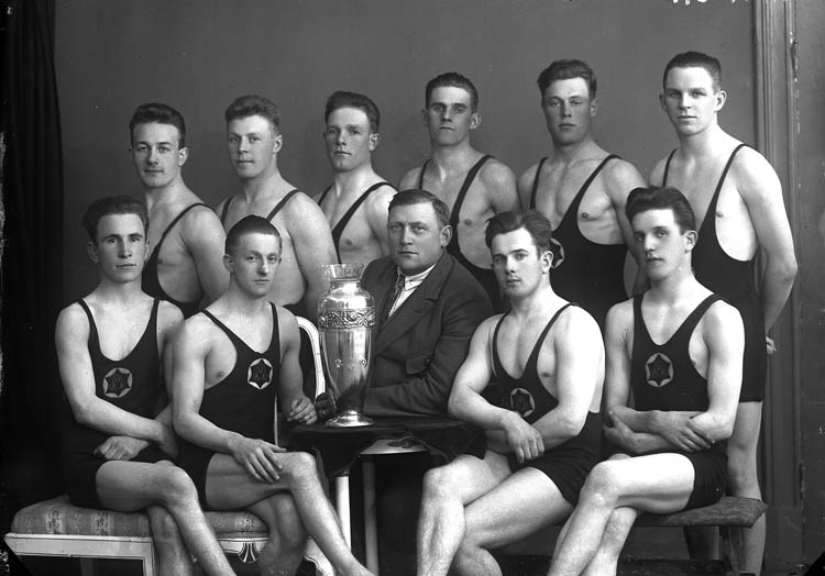 Enligt tidigare noteringar: "Gruppfoto av brottare U. A. K. = Uddevalla Atlet Klubb."