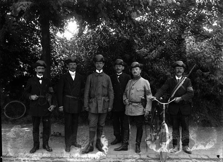 Enligt tidigare noteringar: "Gruppfoto av landstormsbefäl med uniformsmössor, en med cykel. Landstormsstab i Uddevalla år 1914. I grå rock David Jacobowsky nr 3 vänster Kammarskrivaren G.Swanberg.