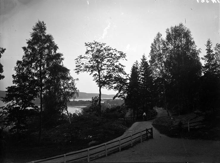 Enligt tidigare noteringar: "Utsikt från Kasen mot villa Solvik, i förgrunden väg med staket."