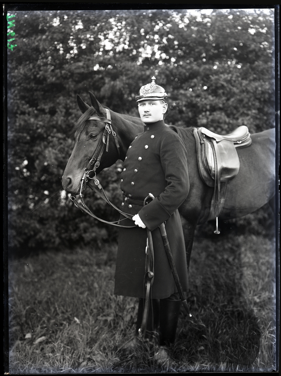 Enligt tidigare noteringar: "Polisen, ridklädd med kask, vid sin sadlade häst. Ridande polis från Göteborg tjänstgjorde i Uddevalla under generalstrejken året 1909".