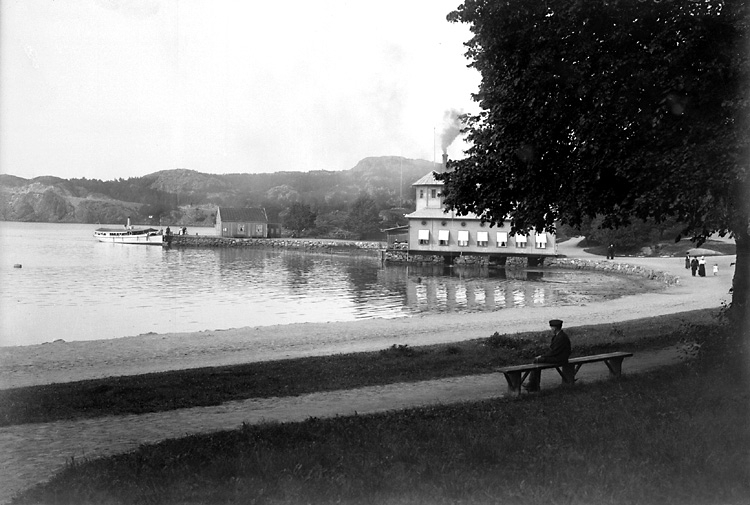 Enligt tidigare notering: "Gustafsberg, badhuset och Gustafsbergsbåten vid bryggan".