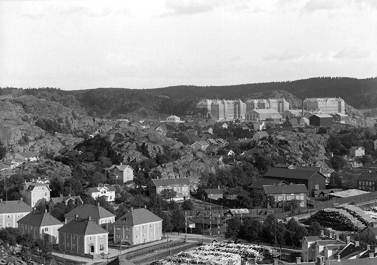 Enligt tidigare notering: "Bohusläns regemente sett från nordväst från Hökebergeg. Till vänster i förgrunden kvarteret Örnen".