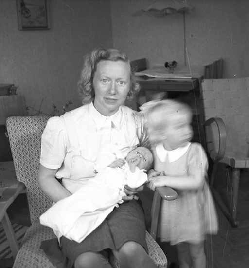 Text till bilden: "Ingrid Olsson m. 2 barn. 1946 maj".