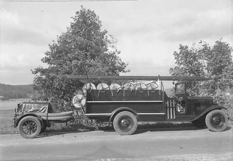 Text till bilden:"Brandbil på en grusväg med stegar, slangar och en släpvagn. Ljungskiles första brandbil".