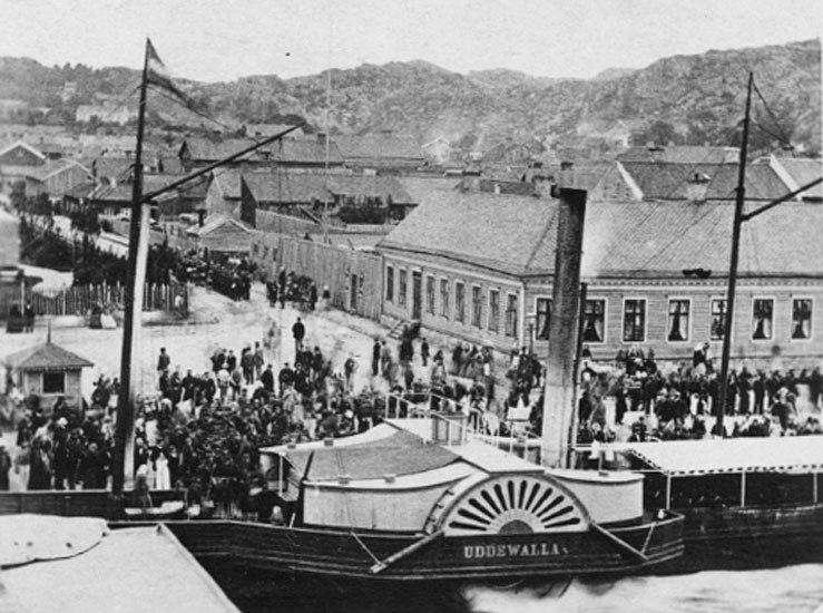 Bilden var uppklistrad på ett A4 papper. På papperet under bilden stod följande handskrivna text: "Hjulångaren Uddevalla klar för transport av skarpskyttar 1860-talet".