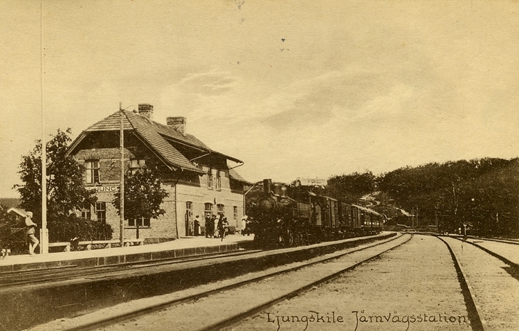 Enligt Bengt Lundins noteringar: "Ljungskile. Järnvägsstationen med folk och tåg".