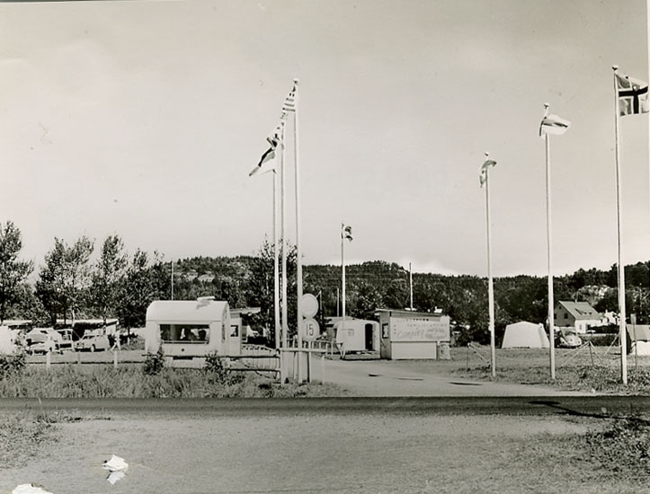 Enligt Bengt Lundins noteringar: "Ljungskile camping. Entré med flaggor Kiosk".