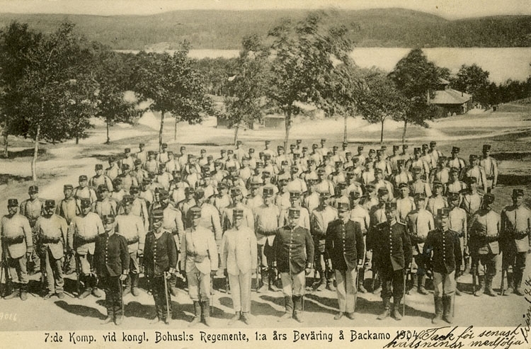 Enligt Bengt Lundins noteringar: "7:de kompaniet vid kongl. Bohusläns Regemente, 1:a års beväring å Backamo 1904".