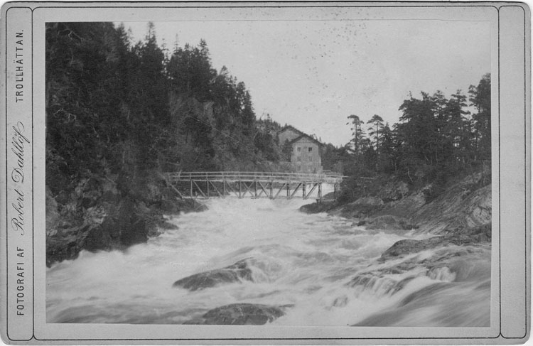 "Albertska träbron" över vattenfall och i bakgrunden Strömsbergs kvarn, Trollhättan