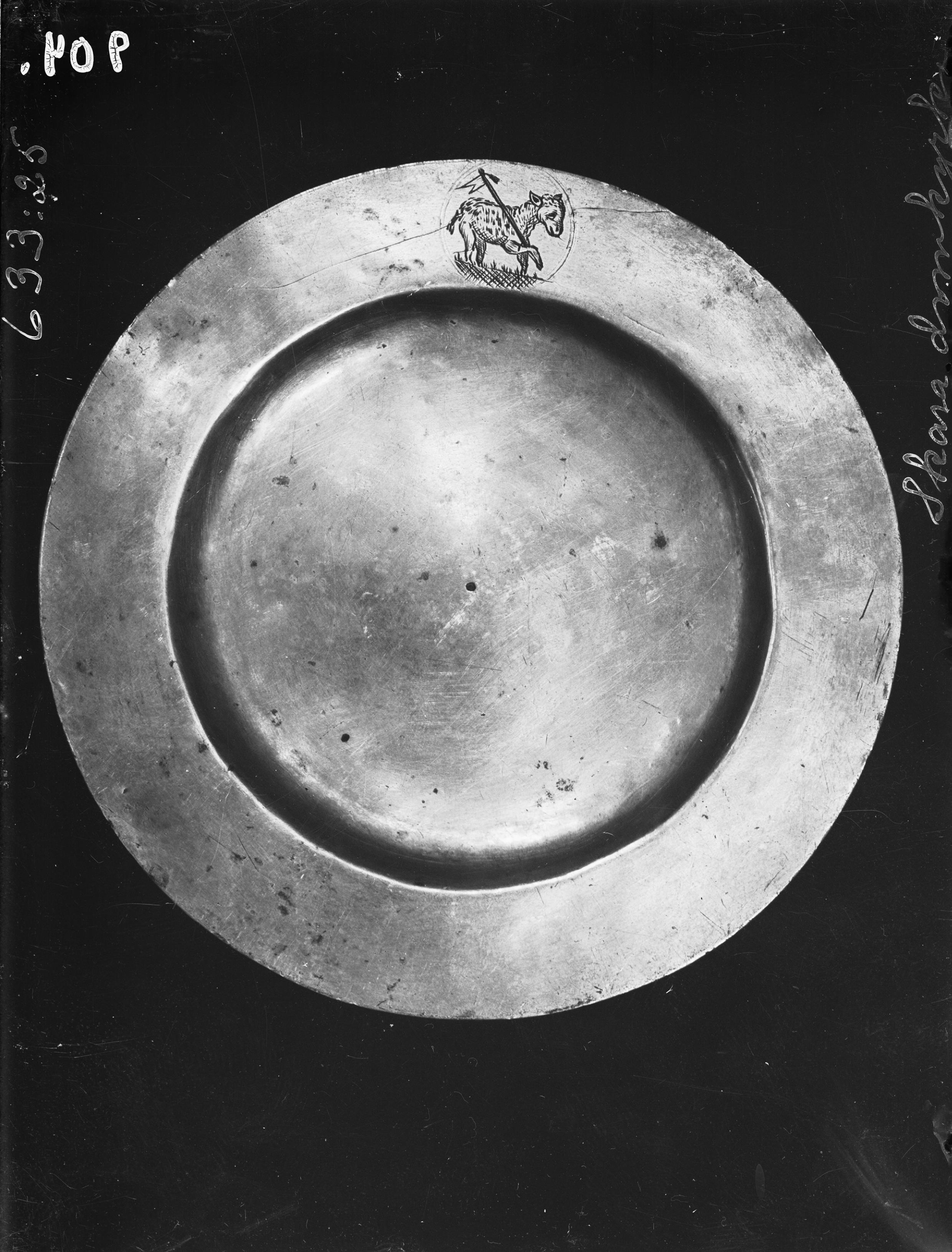 Patén, förgyllt silver, gravyr med stående Agnus Dei på brädden, 1545.