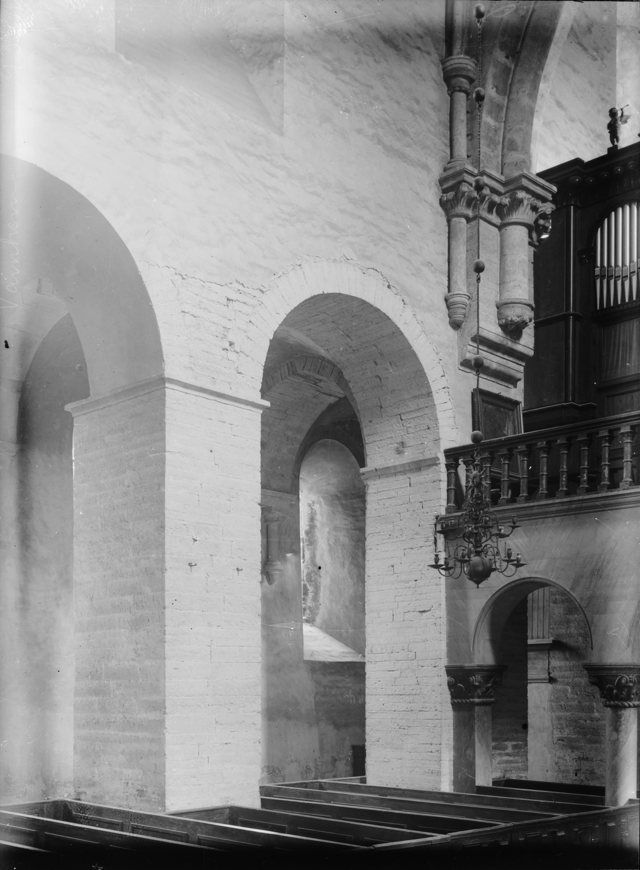 Mittskeppets nordvästra del, puts och fogning avknackad på pelare och bågar.