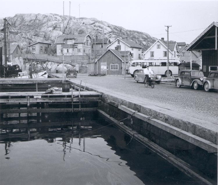 Noterat på kortet: "Gravarne Bäckevikstorget ca. 1950. Byggn. närmast till v. om bussen är den nu (1959) nedrivna brandstationen".
