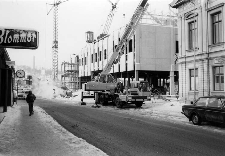 Norra Hamngatan västerut. Bygget av kvarteret Koch i hörnet av Västerlånggatan och Norra Hamngatan fortgår. Till vänster i bild syns Viola Blomsteraffär.