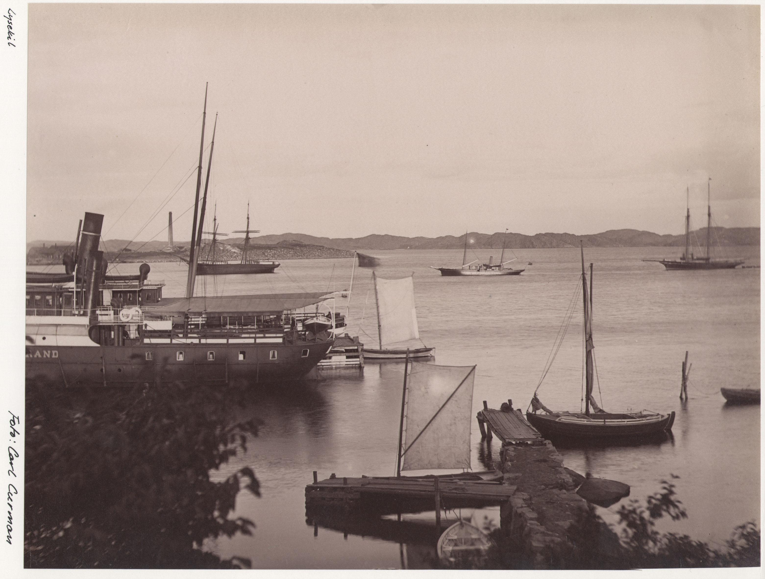 Båtar, i hamn och på redden på Gullmarn (Gullmarsfjorden). Till vänster ångbåten Marstrand och skorstenen till fabriken på Grötö.