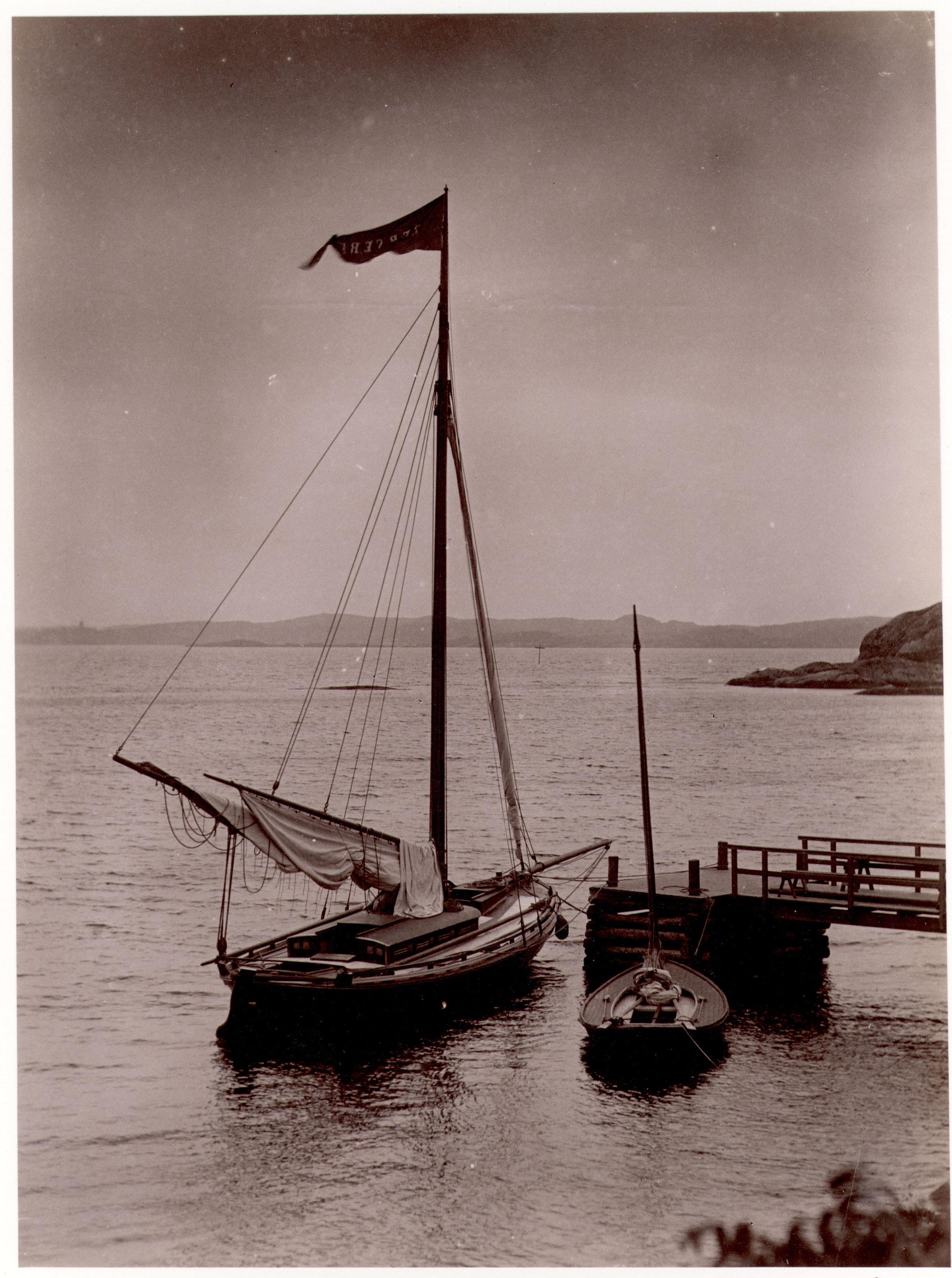 Båtar vid brygga. Skaftö på andra sidan Gullmarn (Gullmarsfjorden).