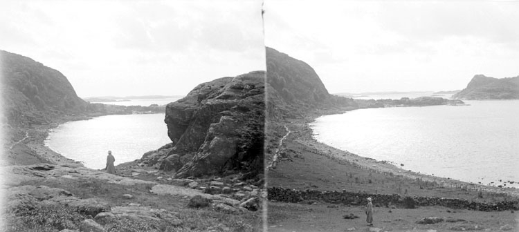 (Stereo karta XVIII) Utsikt från stigen utmed norra sidan av ön, mot samhället på västra udden, Västerö. 14 Augusti 1927.