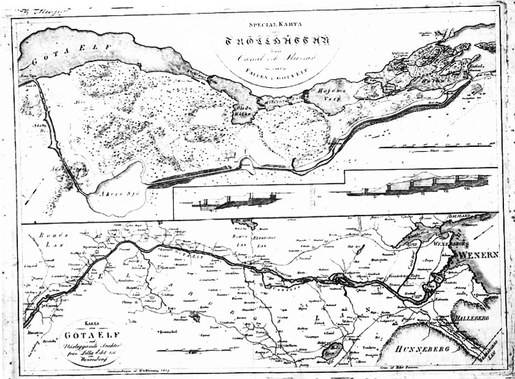"Special Karta öfver Trollhättan dess Canal och Slussar Fallen i Göta Elf i Väne härad och Älvsborgs län" samt undre kartan "Karta öfver Göta Elf med Närliggande Trakter, från Lilla Edet till Wenersborg"