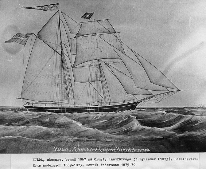 Text som medföljer kortet: "Hulda, skonare, byggd 1867 på Orust, lastförmåga 34 nyläster (1873). Befälhavare: Hans Andersson 1869-1873, Henrik Andersson 1875-79".