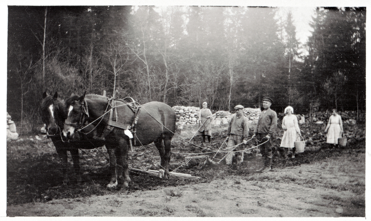 Enligt medföljande text: "Potatissättninge på nyodling i Lillevatten år 1924. Fr v Berta, Erik, George, Hulda (4 syskon Gustafsson) näst sista kvinnan är Märta, Eriks hustru".