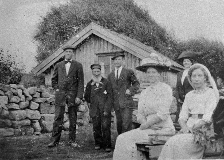 Enligt medföljande text: "Ryggåsstuga uppförd på sin nuvarande plats år 1811. Ditflyttad från obekant plats, men lär redan 1811 varit ålderstigen. Stugan ombyggdes 1889, och fick då torvtaket utbytt mot tegeltak. Upptill midjehöjd vilar stugan på en vall med uppkastad jord. Gotte-Lars, som levde till 1924, var den sista som bebodde stugan. Gotte-Lars är den kortväxte mannen med skägg. Numera ägs och vårdas Gotte-Lars stuga av Svenneby Hembygds- och fornminnesförening":